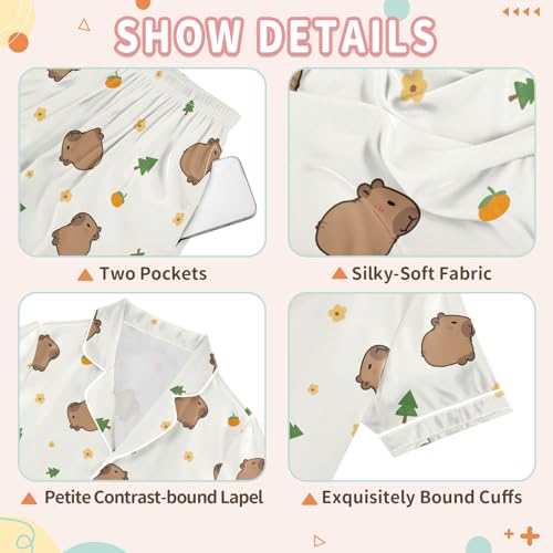 Cute Capybara with Trees Summer Satin Pajama Set, Cute Button-Down Sleepwear Pj Set for Sleep Wears 4