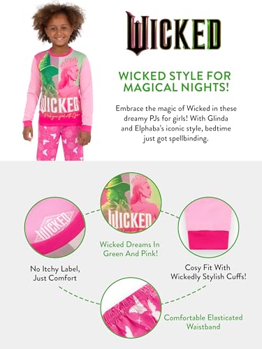 • Charming Wicked Details: Featuring the fun slogan "Pink goes good with green," the Wicked logo, and a delightful pattern of Glinda’s crown, butterflies, and the Wicked "W" on the pajama bottoms, these kids pjs are packed with wickedly thoughtful details