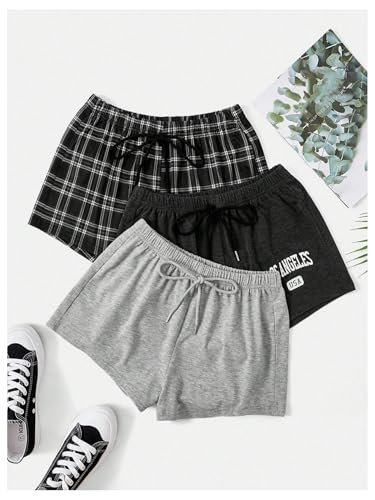 WDIRARA Women's 3 Pack Plaid Letter Graphic Pajama Shorts Elastic Waist Pj Lounge Shorts 3