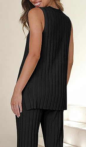 Tankaneo Two Pieces Outfits Sleeveless Top Knit Sets Trendy Lounge Long Pajamas Set 4