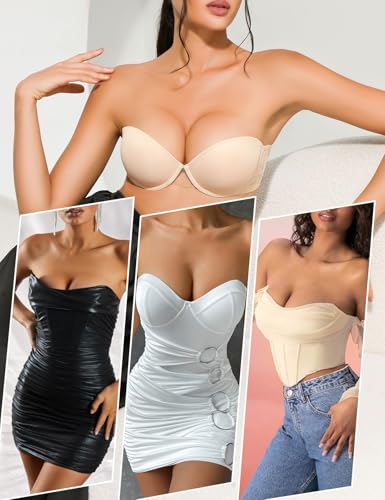 • Strapless Push Up Bra: Soft and thick padded cup with underwire gives your girls a nice shape as well with a generous lift and enhances cleavage for a sexy look, which adds one even two cup sizes.