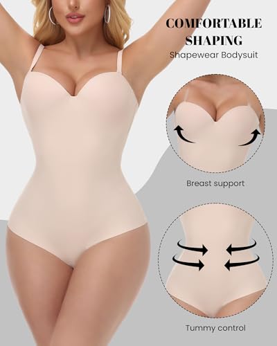 • 【Flexible to adjust bra size】Our sculpting bodysuit is designed with adjustable hook-and-eye closures at the back, allowing you to easily customize the fit for your unique bust size. The sides of the breasts are also designed with steel bones to enhance side support and prevent the breasts from sliding outward. Plus, the detachable shoulder design includes two color-matched straps and two clear straps, giving you seamless versatility for any outfit.