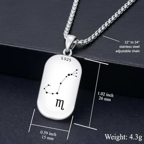 • ★ PRODUCT DIMENSIONS ★ Stamped with "S925", this 925 sterling silver zodiac necklace is hypoallergenic and harmless to sensitive skin. Color: oxidized silver. Chain: adjustable stainless steel rolo chain. Length: 22" to 24". Dog Tag Pendant: 0.59" (15.1 mm) wide, 1.12" (28.5 mm) long. Pendant weight: 4.3g. Packing: branded jewelry gift box.