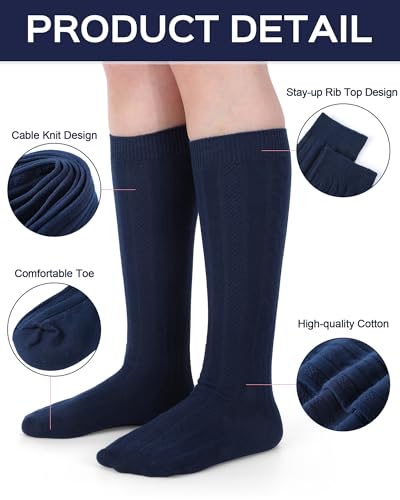 Eurzom 4 Pairs Knee High Uniform Socks for Girls 5-12y Acrylic Knit Cable Navy Blue White School Sock Back to School Gifts 6