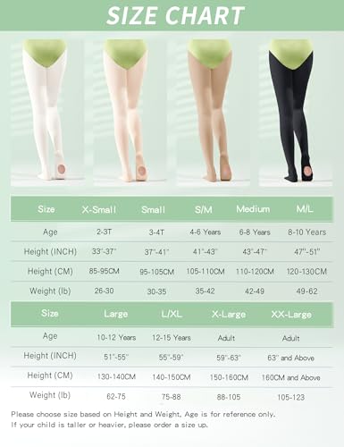 • Professional-grade ballet tights with round opening at the bottom of the feet,Convertible between full tights and footless.When you need to rest or adjust at the end of the class, you don't have to take off the entire pantyhose. Just put the feet through the round opening and roll the girls dance tights up to the ankle to relax the feet, and perform feet care or adjust the toe protection cover, which is convenient and practical.