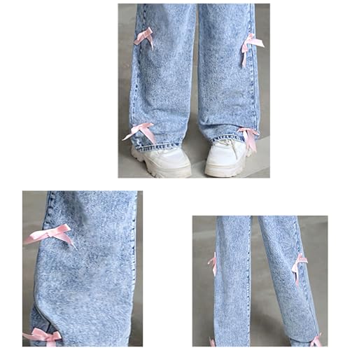 Girl's Bowknot Elastic Waist Denim Pants Straight Wide Leg Jeans with Pockets for 1-10 Years 4