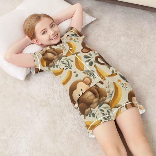 Satin Pajama Sets Short Sleeve Cute Monkey Banana Leaf Button Down Silky Nightwear 2 Piece PJS 5Y, 7