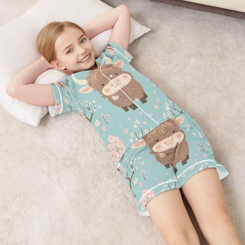 Satin Pajama Sets Short Sleeve Highland Cow and Cherry Blossom Button Down Silky Nightwear 2 Piece PJS 5-14Y 7
