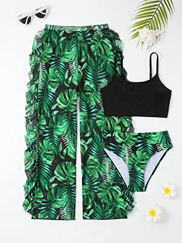 SHENHE Girl's 3 Piece Tropical Print High Waist Bikini Swimsuit with Cover Up Pants 3