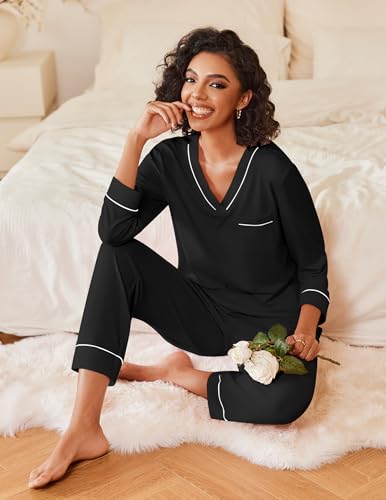 Ekouaer Women's Pajamas Sets 2 piece PJs V Neck Long Sleeve Sleepwear Comfy Pants Loungewear with Pocket 1