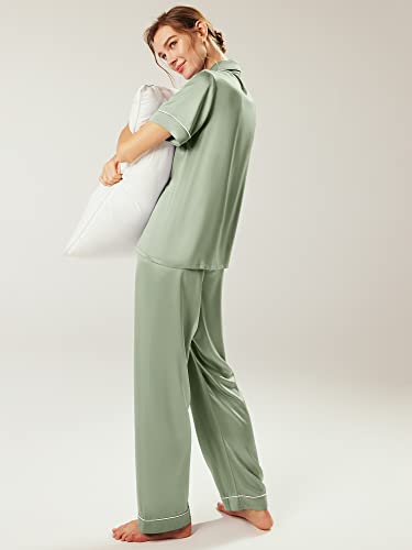• 👚Button Down Pajamas Women: The classic button-down pajamas feature a relaxed fit, perfect for lounging or sleeping. The silky women's pajama bottoms come with a comfortable elastic waist, paired with a smooth short-sleeve V-neck top, complete with a chest pocket, making this set ideal for all seasons.
