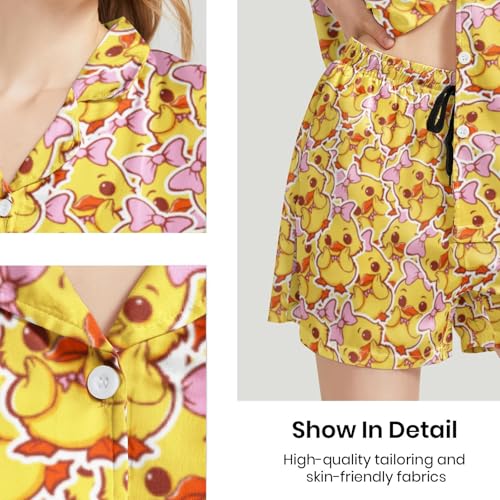 • Cute Pajamas Features: Duck pajamas for women include a short sleeve top and shorts. Pajama top has a button closure, while the shorts have a stretch elastic waistband and adjustable drawstring for easy on and off. Silky pajama set for women combines practicality with elegance. Pajama pants come with 2 side pockets for your phone or small items. Lightweight summer pajamas sets allow you to move freely and bring ultimate relaxation and comfort to your leisure time, whether day or night