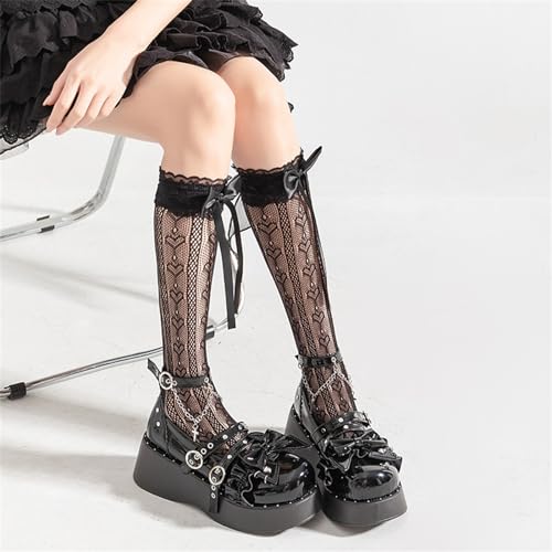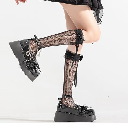 Womnes JK Girl Hollowed Out Heart Over Calf Socks Japanese Cute Ribbon Bowknot Ruffle Lace Trim Stockings Ruffl 4