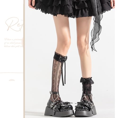Womnes JK Girl Hollowed Out Heart Over Calf Socks Japanese Cute Ribbon Bowknot Ruffle Lace Trim Stockings Ruffl 1