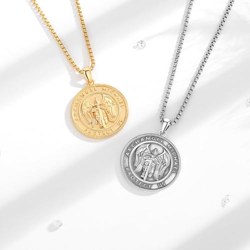 INFUSEU St Michael Pendant for Men Saint Michael the Archangel Necklace Sterling Silver 925 Medal Espada De San Miguel Arcangel Catholic Gifts Christian Jewelry Religious Sword Guard Knight Coin 1