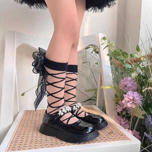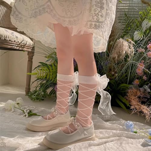 HOT ! 2 Pairs Girls’ Socks Princess Style Tulle Mid-Calf Crew Socks with Bow and Heart Studs, Sparkly Summer Thin Mesh Socks