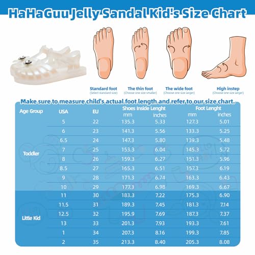 • CHOOSE YOUR SIZE - These Jelly Sandals feature inclusive sizing from 5-13,Applicable toddler size, little kids size, big kids size.Tip: We provide general age recommendations for each size,but each child's foot is unique,in order to make your child more comfortable to wear,we recommend that you first measure your child's foot length refer to our size chart to choose the most sitable size for your child.