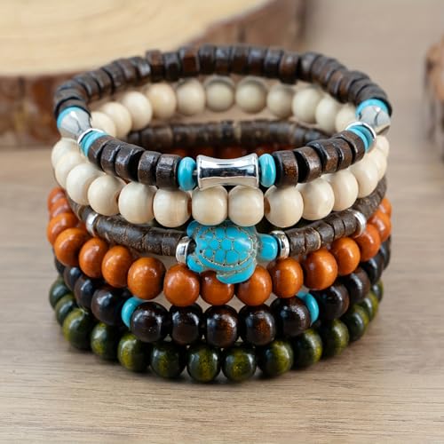 • VERSATILE SET: Complete set of 6 wooden beaded bracelets featuring natural colors including brown, orange, cream, and dark green