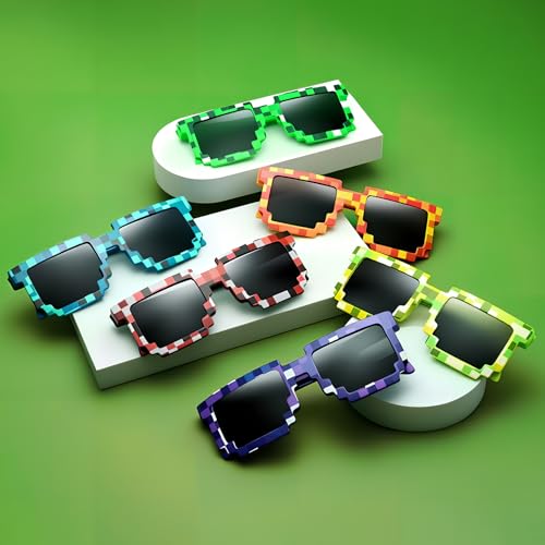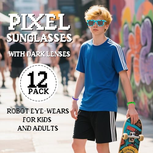• 24-Piece Value Pack:12-piece pixel sunglasses set (red, orange, yellow, green, blue, purple) + 12 pixel wristbands. ideal party decorations & favors! Unisex design nails streetwear vibes, perfect for group gatherings, video game party decorations, and family trips for adults and kids.