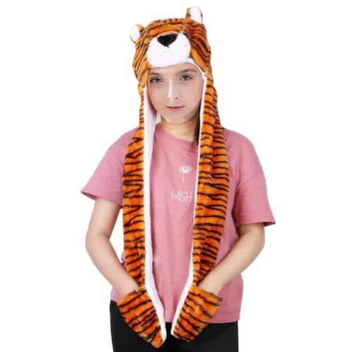 • Unique 3 in 1 combo-- This amazing animal hat provides you three benefits at a time. no more hassle of carrying lots of items for everything, 3-in-1 function meet all you need, very convenient for you. The mittens can also store cellphone, candies and other small things easily.