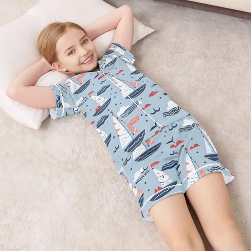 ALAZA Sailboat Bird Blue Satin Pajamas Set Short Sleeve Button Down Sleepwear Summer Pjs 2 Piece 1