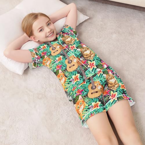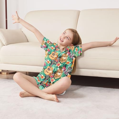 ALAZA Colorful Hawaiian Cat Kitten Guitar Pajamas Satin Pajama Set Short Sleeve Button Down Sleepwear 1