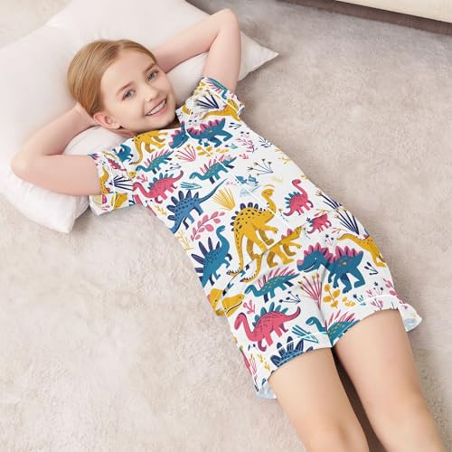 HOT ! ALAZA Cute Funny Dinosaur Leaves Pajamas Satin Pajama Set Short Sleeve Button Down Sleepwear