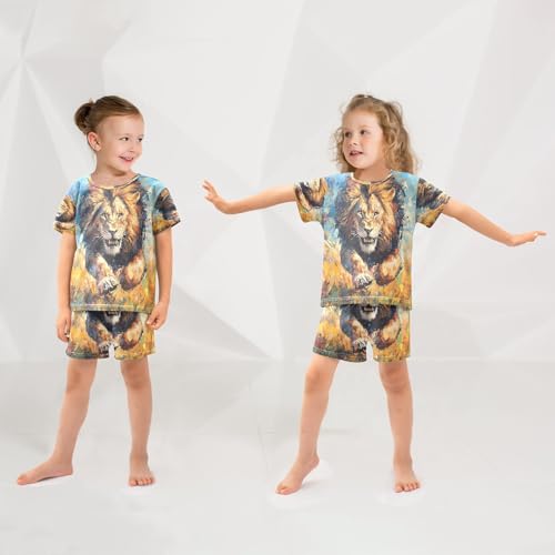 ALAZA Lion Watercolor Oil Painting Pajamas Set Short Sleeve Cotton Sleepwear Summer Pjs 2 Piece 5-14Y 2