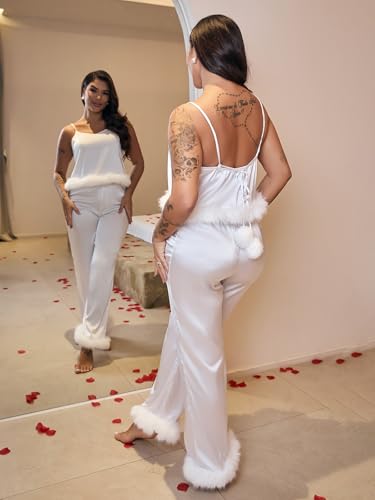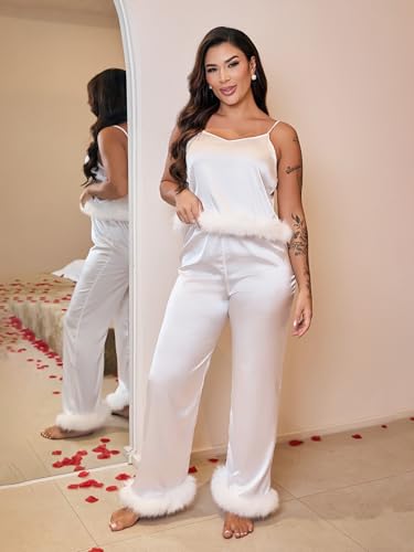 • LUXURIOUS DESIGN: Two-piece satin pajama set featuring elegant white fabric with plush faux fur trim detailing at the pants hem and top edges