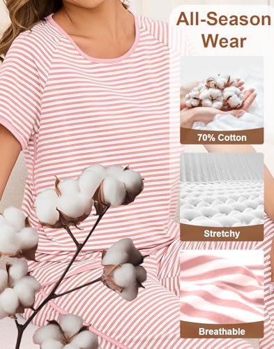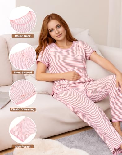 Womens Striped Pajamas Sets 2 Piece Cotton Comfy Lounge Set Short Sleeve Pjs Crewneck Loungewear with Pockets 2