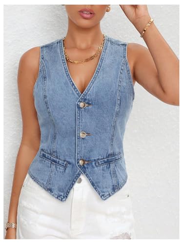 HOT ! MakeMeChic Women's Jean Vest Top Y2k V Neck Sleeveless Denim Top Single Breasted Crop Jacket Cowboy Chic