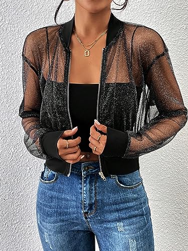 Milumia Women's Sparkly Sheer Mesh Long Sleeve Crop Jacket Light Weigh Zip Up Outwear 5
