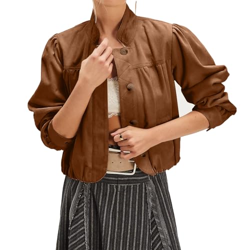 More information about Women's Suede Short Pilot Jacket Puffed Long Sleeve Button Stand Collar Spring Autumn Coat Retro Moto Style