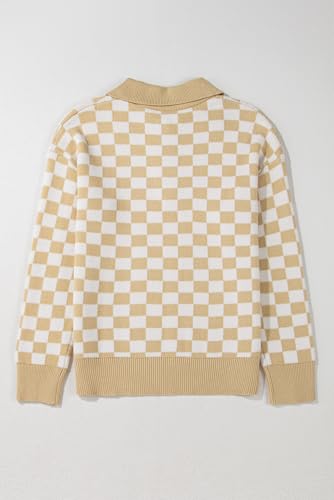 HOT ! Women's Apricot Checkered Buttoned Collar V Neck Drop Shoulder Sweater