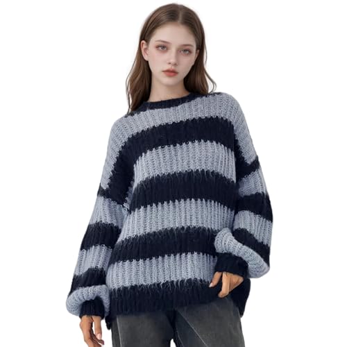 More information about Autumn/Winter Striped Medium length Sweater, Suitable for Girls, Long Sleeve Round Neck Casual Loose Hoodie, Blue
