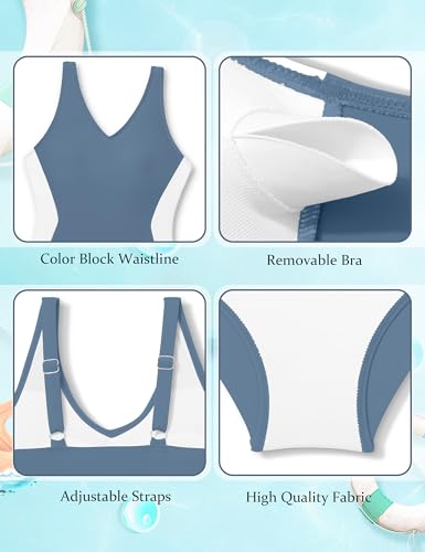 Shallmu Girls Swimsuit One Piece V-Neck Adjustable Straps Color Block Waistline Bathing Suit Swimwear 11-18Y 5