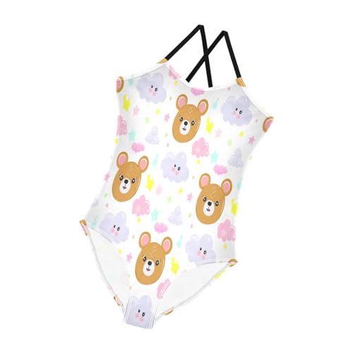 Cute Cartoon Bears Clouds White One Piece Girls Swimsuit with Adjustable Shoulder Strap, Beach Swimsuit, 3-10 5