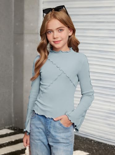 HOT ! Girls Long Bell Sleeve Shirts Mock Neck Lettuce Trim Ribbed Knit Blouse Slim Fit Y2K Inspired Fashion Tops 6-14 Years