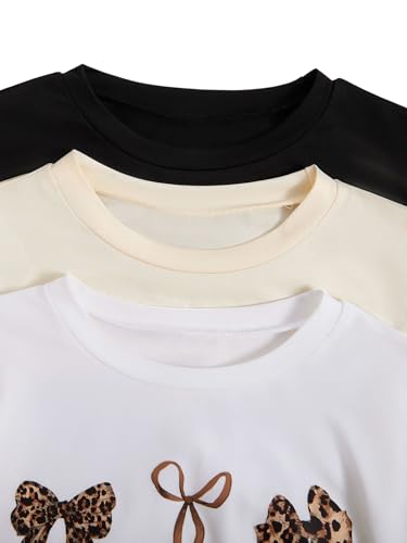 Floerns Girl's 3 Piece Cheetah Short Sleeve T Shirt Bowknot Print Tee Going Out Tops 3