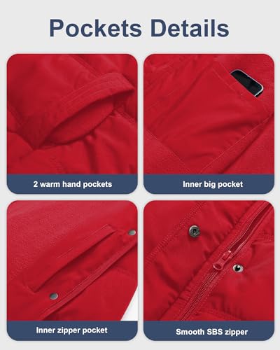 • ❄Plenty of pockets--2 fleece side pockets to instantly warm your hands. 1 chest zipper pocket, 1 inner zipper pocket, 1 inner hook & loop pocket. the basic pockets are deep enough for keeping all your essentials, keys, wallet, and small items safe. The stitching and seams are all straight, well made, durable snaps and sturdy SBS zipper for Lasting Wear.