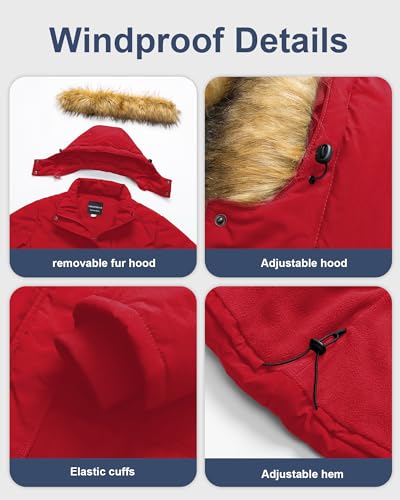 • ❄Protects from wind--Detachable fur hood with Button closure and adjustable buckle, adjustable buckle hem and elastic rib cuff protect you from the cold wind. Durable shell with 5000mm waterproof finish and transparent membrane keep you warm and dry.