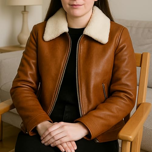 More information about Women's Genuine Leather Jacket with White Faux Fur Collar – Brown Classic Bomber Style Soft Inner Lining