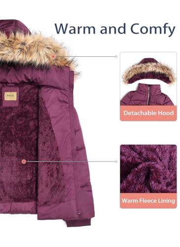 BodiLove Women's Puffer Jacket with Removable Faux Fur Hood and Zipper Burgundy L 4