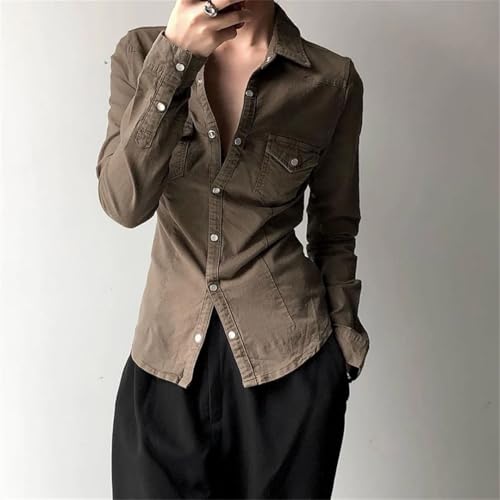 Women Streetwear Cargo Style Blouses Tops Long Sleeve Denim Shirt Pockets Solid Coat 5