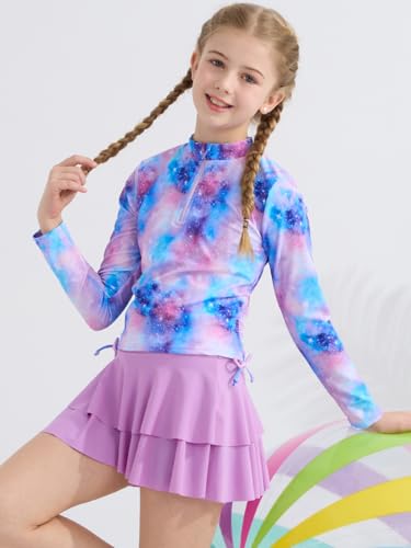 • Girls Two Piece Swimsuit Long Sleeve: long sleeve shirts with half zip, 3d unique print, pattern cover up skirts with shorts bottoms, adjustable drawstring rashguard top, cute and fashionable