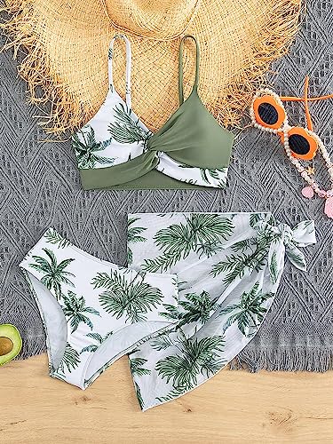 • V Neck, Colorblock, Twist Bikini Top with Bottom, Tropical Print, 3 Piece Bikini Swimsuits, Wrap Cover Up Skirt