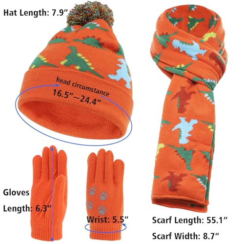 Kids Winter Hat Gloves Scarf 3 Piece Set Toddlers Dinosaur Pom Pom Beanie Children Knitted Warm Set 4