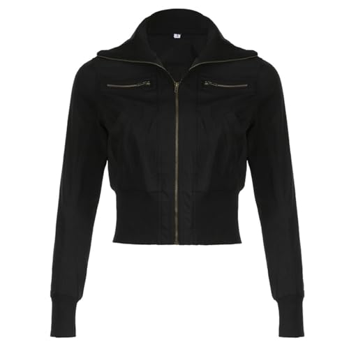 Womens Bomber Jacket Y2k Lapel Long Sleeve Cropped Light Jacket Zip Up Cargo Jacket Fall Coat 90s Streetwear 1