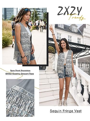 ZXZY Womens Sequin Fringe Sleeveless Vest Sparkly Lightweight Fitted Jacket Cardigan 2