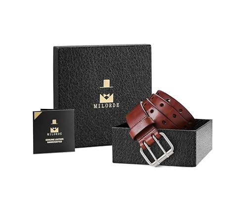 HOT ! MILORDE Men's Jean Leather Belt Double Prong, 35mm 100% Genuine Leather, Handmade, Classic Designs for Work and Casual